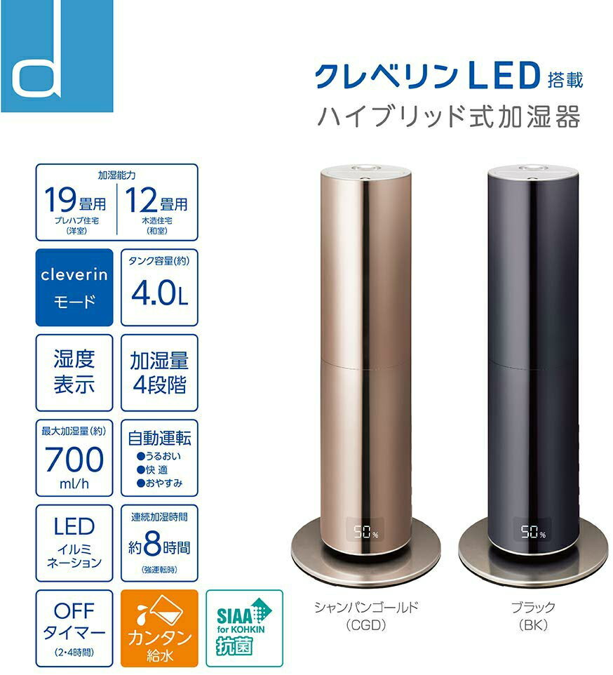 d-design クレベリンLED搭載 ハイブリッド式加湿器 | KMHU-701C CGD | シャンパンゴールド | タイマー付 | ドウシシャ 1年保証